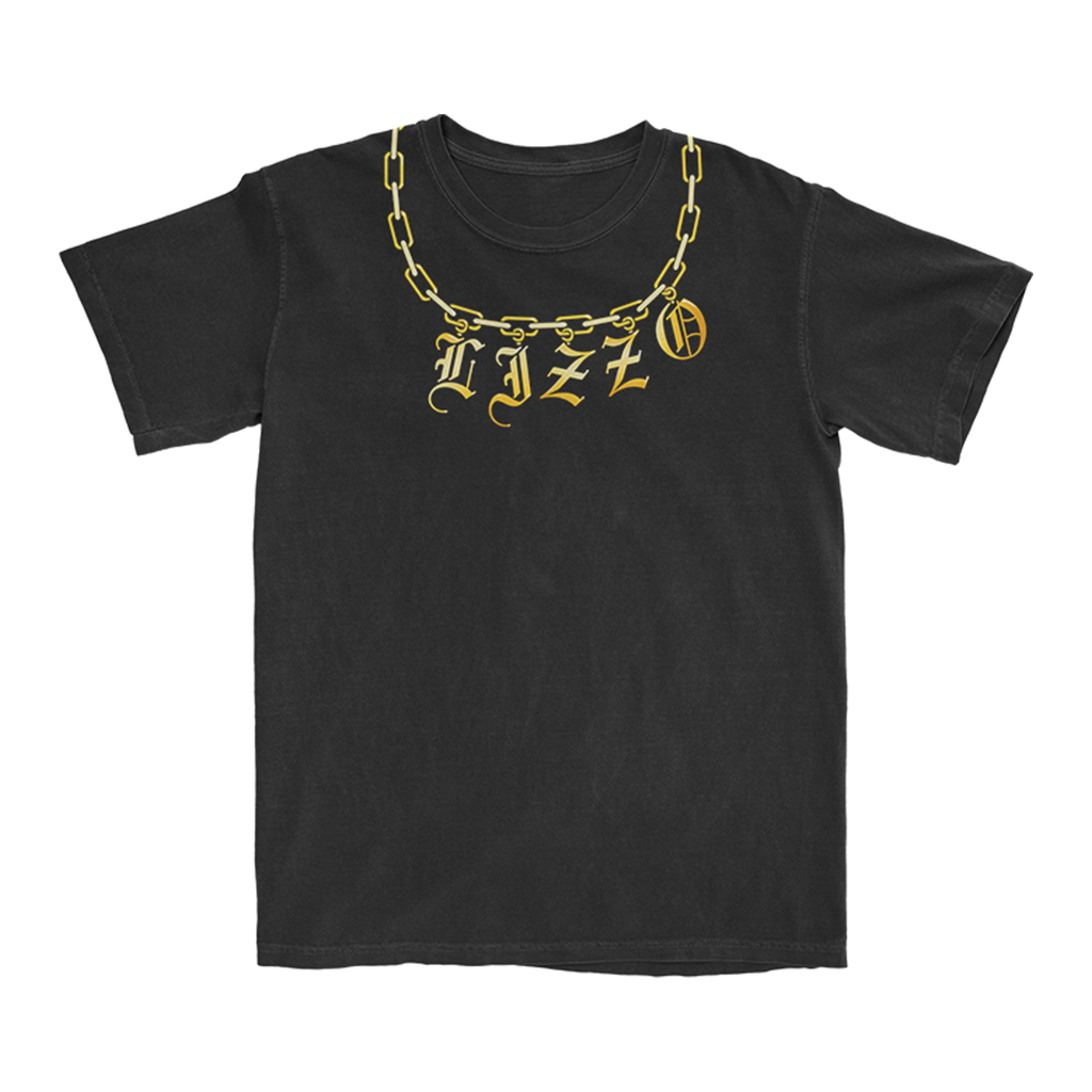 The Lizzo 'Chain T-Shirt' features a gold Lizzo chain design printed on the front and back of a 100% cotton black unisex t-shirt.