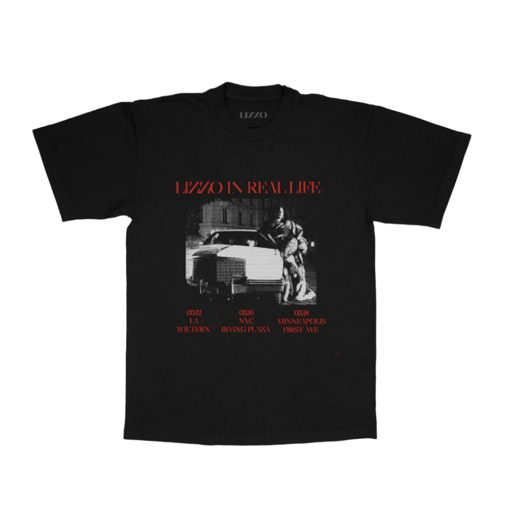 Lizzo in Real Life on a black unisex t-shirt with a photo image of Lizzo featuring performance dates.